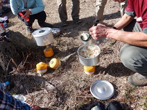 コメント T1三鷹ハイキングクラブの4名が三鷹市登山教室補講の三鷹市山岳連合会とアロカ会の合同山行「景信山での餅つき大会」に参加。総勢27名、山岳連合会が12名、アロカ会が13名。 絶好の登山日和、小仏バス停は続々と下りてくるハイカーでいっぱいになった。集合確認と準備体操を済ませ歩き始めた。登山口から舗装道路を離れ 急な山道となった。急登を終え杉林から抜け出ると葉を落とした広葉樹の森、日本山岳会多摩支部の登山教室40名以上が休憩していた。私達も一休み。最後に約234段の 階段を登り切り景信山山頂に到着。直ぐに、大会の準備に取り掛かった。最初に餃子や豚汁に舌鼓、次にメインイベントの餅つき大会、アロカの仲間は 手慣れたもの、三鷹の仲間ではM氏が頑張った。飛び入りの外人さんもいて、大いに盛り上がった。やわらかい餅で腹いっぱいになり終了。アロカの仲間と別れ、城山と稲荷山を経て高尾山口駅 に下った。
