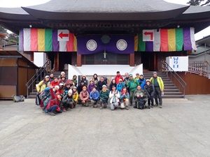 コメント 三鷹市登山教室生(8名)とT1三鷹ハイキングクラブ(10名)の合同の山行、サポート役の三鷹山岳会会員を含め総勢23名。曇り空の下、越生駅に集合し、駅前の広場で準備体操を済ませ、 歩き始めた。最初に訪れた弘法山山頂には諏訪神社の社が有り、無事登山の祈念をした。山頂の東側は開けていて、展望が良く筑波山やスカイツリーが望めた。次に訪れた越生梅林では、開園の準備をしていた人に「見頃は2月中旬」 と教えてもらい、「そのころにまた」と返事をし、大高取山に向った。大高取山は人気が有る山で、多くのハイカーが展望を楽しみながら休憩をしていた。私達はAさんとIさんとが準備をしてくれた「ぜんざい」で体を温めた。 記念撮影を済ませ、桂木観音に向け出発。桂木観音では無事下山のお礼をし、解散地ゆうパークおごせに下った。途中にあった無人の「ゆずとレモン」の販売所で女性陣はレモンを買い占め、主婦の顔が現れた。